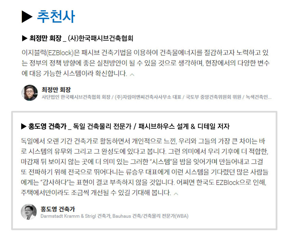 EZBlock은 독일 PHI(Passive House Institute)로 부터 인증서를 수여 받았습니다.